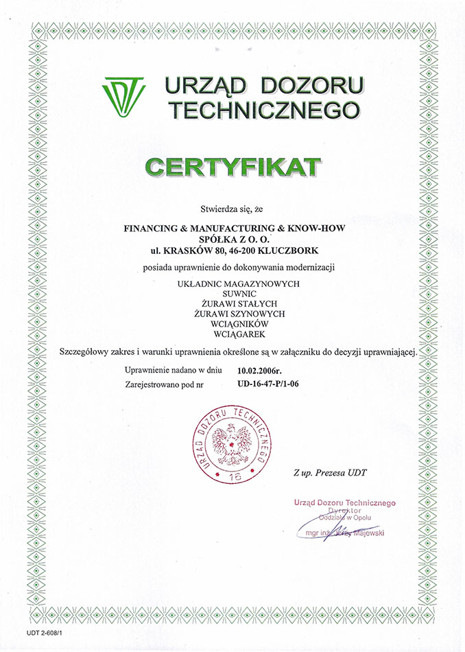 The company has been granted authorisation by the Technical Inspection Authority to modernise storage systems, overhead travelling cranes, fixed and rail cranes, hoists and winches.