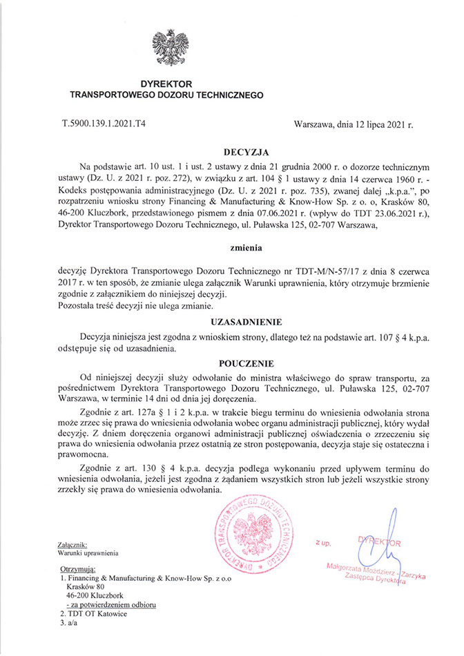 In addition, the company has been granted authorisation by the Transport Technical Supervision Authority to modernise and repair specialised material handling and continuous transport equipment, as well as material handling equipment: wagon tippers, loaders, stackers, loader-stackers, scrapers, belt conveyors, wagon movers, overhead travelling cranes, cranes and hoists.